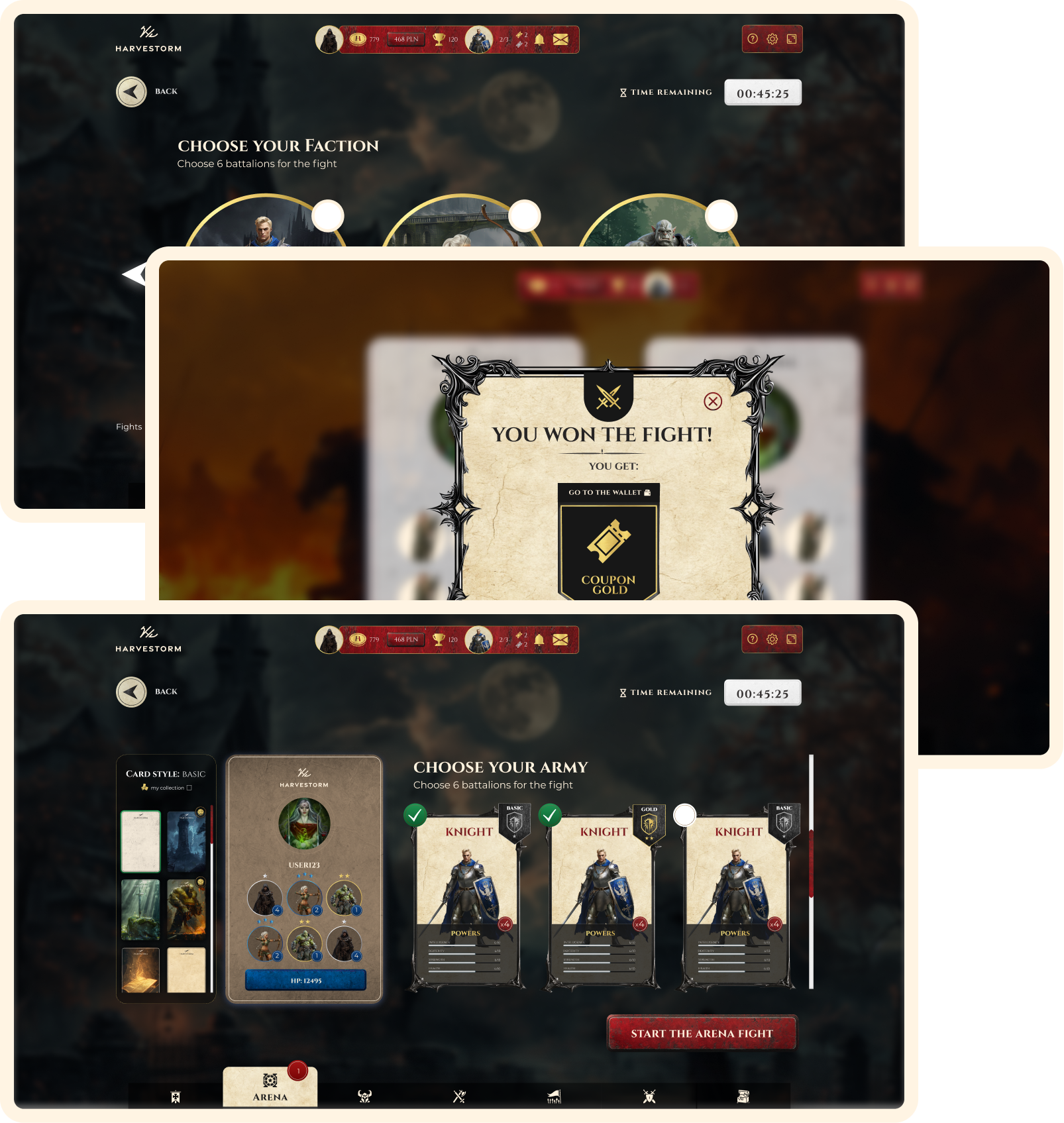 Walcz na arenie o złoty kupon. Twoja podstawowa szansa na zwycięstwo wynosi 30%. Kupuj i ulepszaj postacie, aby zwiększyć swoje szanse aż do maksymalnych 75%.